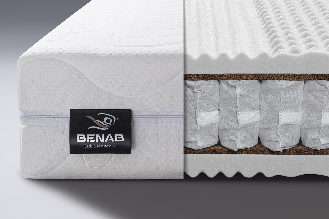⦁ PUR pena 35kg/m3, kokosová vrstva 2 cm 2600 gr/m2 a 3cm 4000 gr/m2, taštičková pružina 250 ks/m2 – 7 zón