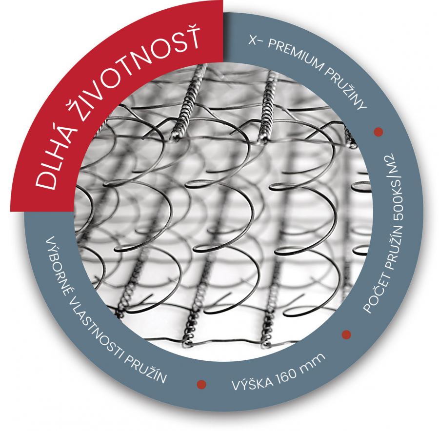 Jadro matraca tvoria X- premium pružiny (500 m2), ktoré poskytujú špičkovú bodovú oporu. Každá pružina reaguje na tlak individuálne a presne tam, kde je to potrebné. To zaručuje, že sa matrac plne prispôsobí telu, podporí chrbticu a pomáha udržiavať správne držanie tela počas spánku. Vďaka tejto technológii sa minimalizuje prenos pohybu, čo je ideálne pre páry.