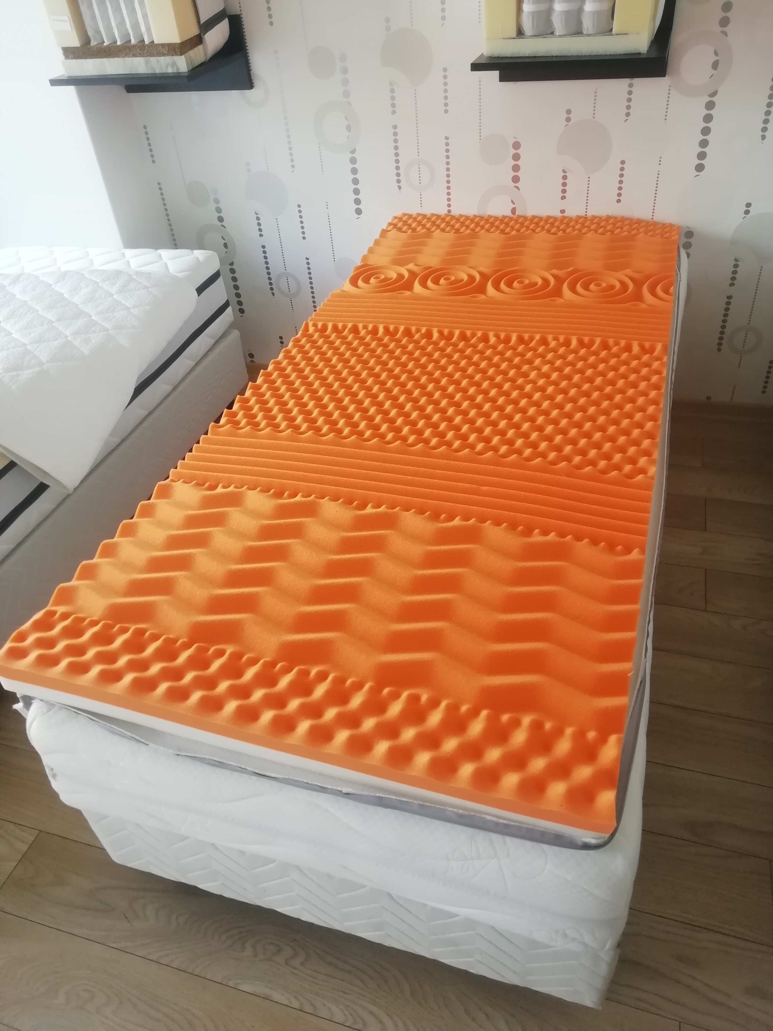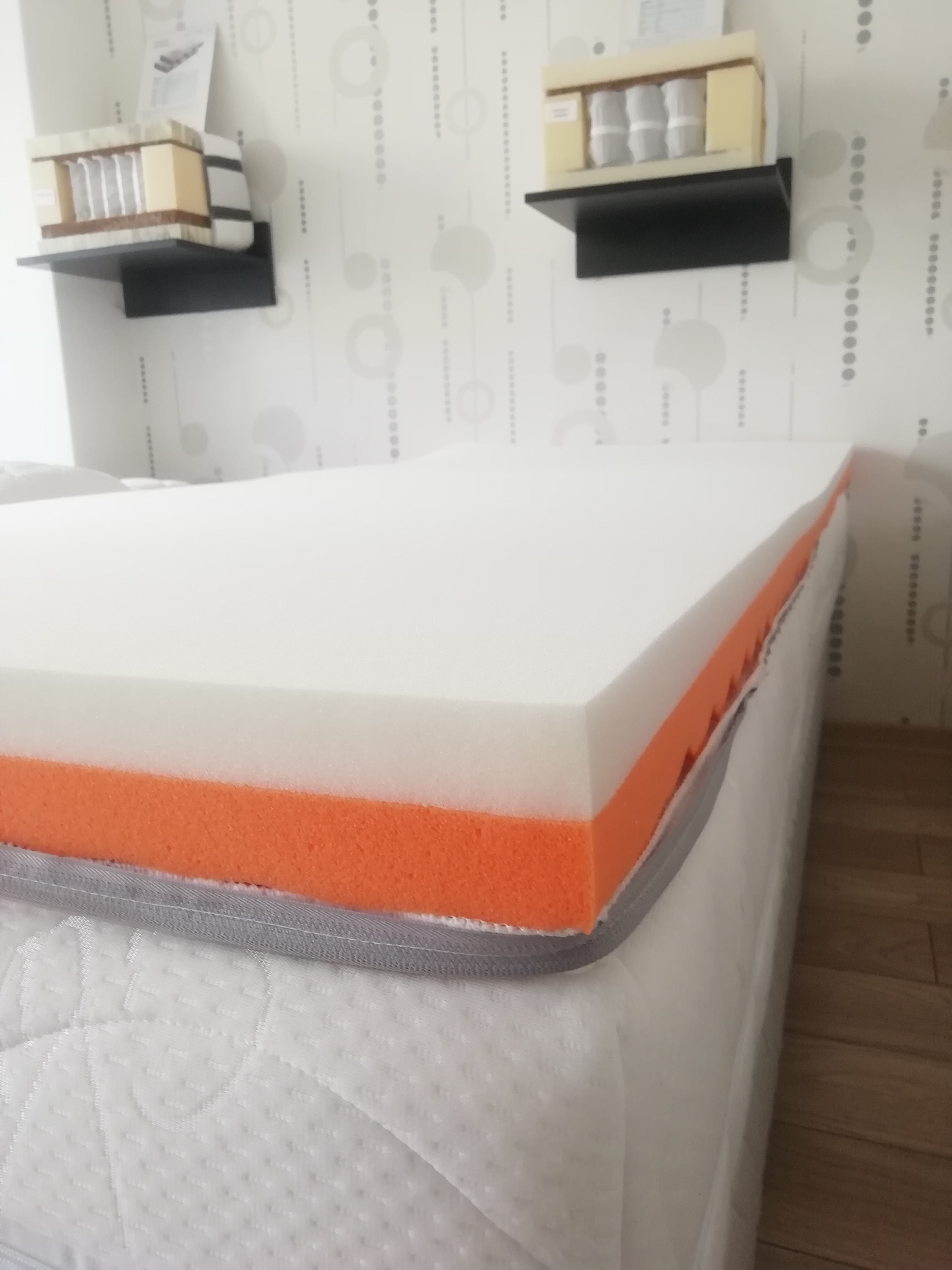 Z jednej strany je 3 cm vrstva 7 zónovej profilovanej pamäťovej VISCO peny, ktorá reaguje na teplo a tlak, dokonale sa prispôsobí vašim krivkám , čo má aj zásadný vplyv na kvalitu spánku, z jednej strany o tvrdosti 2 a z druhej strany je 3cm vrstva kvalitnej HR peny, tvrdosť 4.
